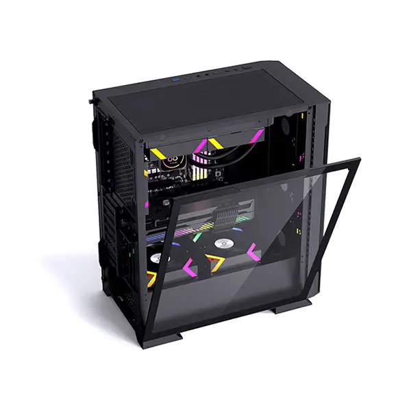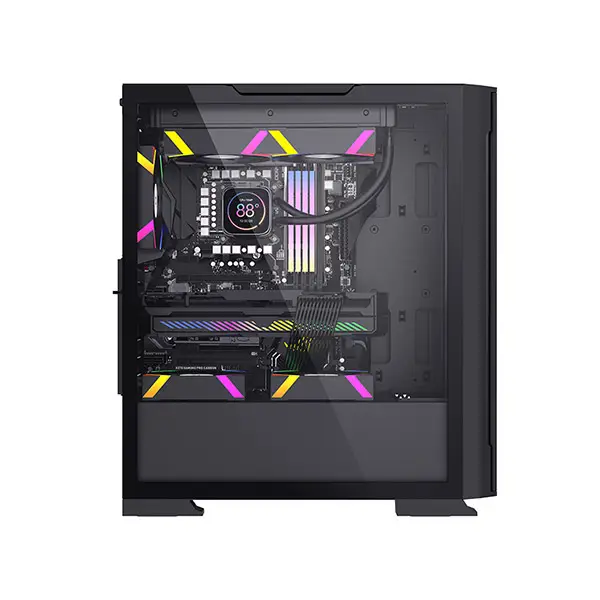 Aresze KT02B Mid-Tower Gaming Casing - Black is designed for E-ATX and ATX motherboards. It features a tempered glass left side panel and a mesh front panel for optimal airflow. The case includes one USB 3.0 port, two USB 2.0 ports, and HD Audio. The pre-installed ARGB fans (4 x 120mm) have an outer 16LED and inner 8LED, and come with an extended cable motherboard connector and reset connector. The GPU cooler height limit is 340mm, and the CPU radiator height limit is 180mm. The case supports a 360 water cooler and vertical graphics card installation.