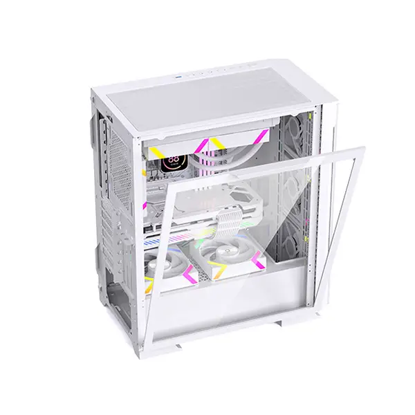 Aresze KT02W Mid-Tower Gaming Casing - White is designed for E-ATX and ATX motherboards. It features a tempered glass left side panel and a mesh front panel for optimal airflow. The case includes one USB 3.0 port, two USB 2.0 ports, and HD Audio. The pre-installed White ARGB fans (4 x 120mm) have an outer 16LED and inner 8LED and come with an extended cable motherboard connector and reset connector. The GPU cooler height limit is 340mm, and the CPU radiator height limit is 180mm. The case supports a 360 water cooler and vertical graphics card installation.