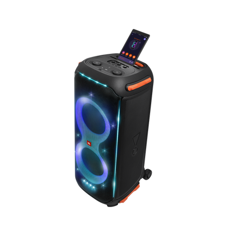 The splashproof PartyBox 710 transforms your next event into a real party, concert or nightclub. With its unique and colorful light show synced to JBL Original Pro Sound. Minimalistic and intuitive top panel controls and the PartyBox App let you create next-level musical and visual experiences. Customizing both the flashing, strobe lights and the amazing sound from the dual set of tweeters and bass-rich woofers. One-button True Wireless Sound instantly pairs two PartyBox 710s for an even bigger crowd. And with an easy-to-grip handle and robust wheels, you can keep the good times rolling wherever the party goes.